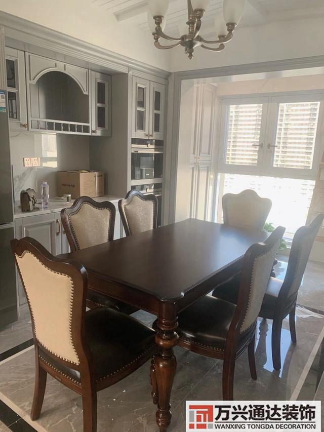 144平四房兩廳南北通透的戶型,其實對于這樣相對面積有點大的房子,選擇裝修美式風(fēng)格也比較合適哈。現(xiàn)在所看到的是餐廳區(qū)域,布置了一張美式實木方形餐桌,占用的空間大小位置合適。旁邊定制了一個非常實用的大酒柜,可以提供大量的儲物空間。定制的餐邊柜,在造型上比較常見,而且偏灰色,非常耐臟。家里餐廳區(qū)域空間足夠大的,其實選擇設(shè)計餐邊柜,很有必要。以后生活過程中,很多東西都可以方便收納起來。地面做了黑色與白色搭配的波導(dǎo)線條,增加了視覺沖擊感。